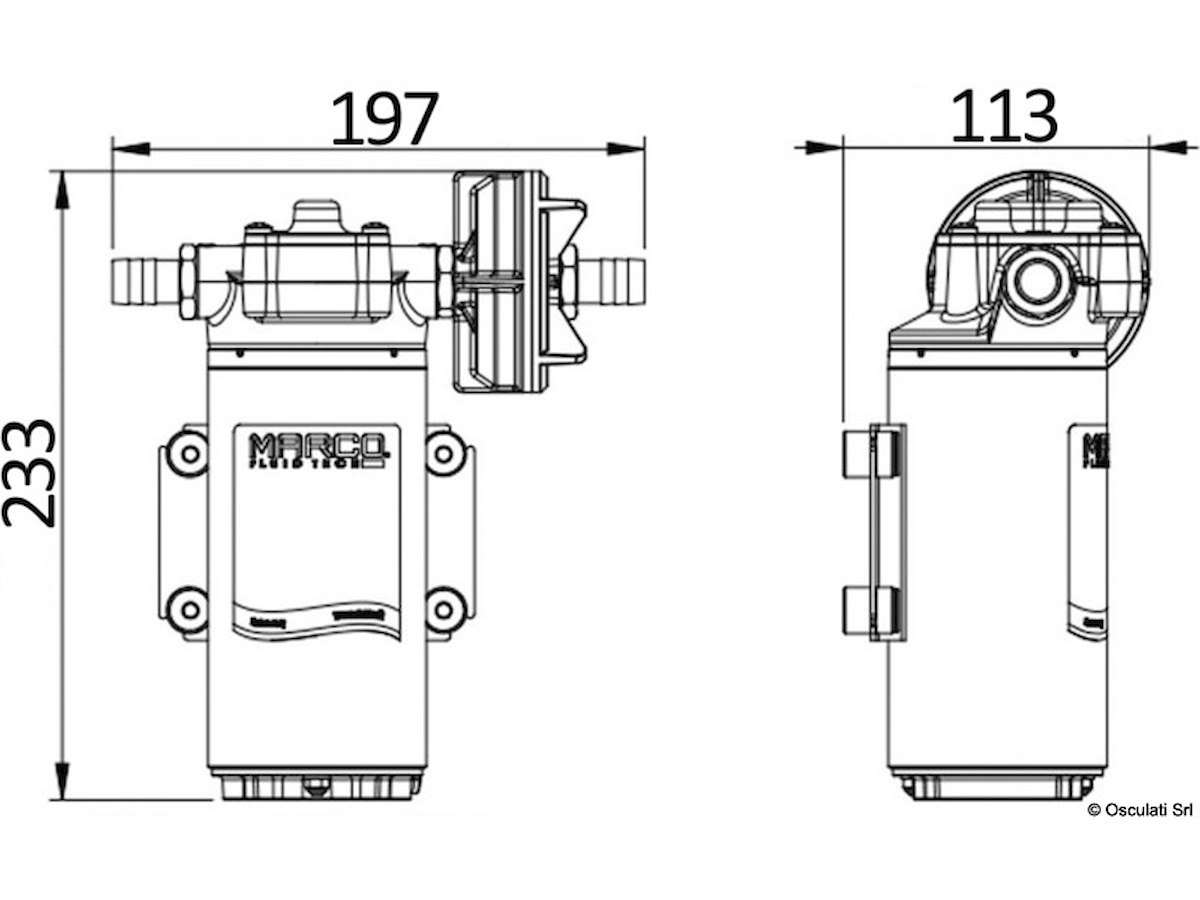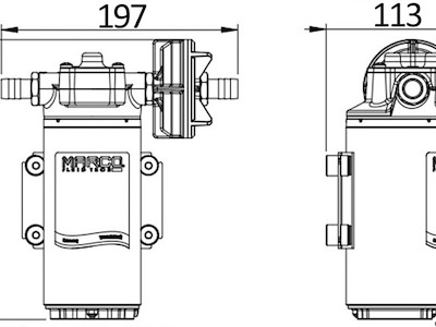Sigla: UP12-LP V: 12 Consumo A: 14 Portata l/min: 26 Prevalenza m: 3 Pressione bar: 3 Watt: 360 Ingresso: 1/2" Uscita: 1/2" misure mm: 233x197x113
