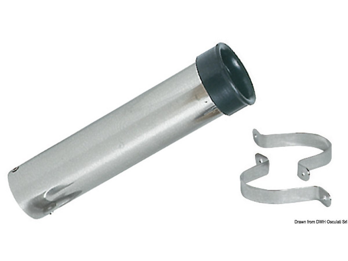 In acciaio inox , fissaggio con 2 fascette, boccola interna in PVC anti-usura. Ø interno mm: 41 Lunghezza mm: 229