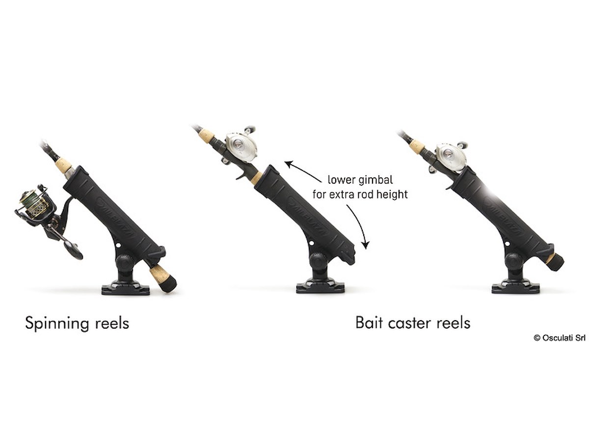 • Per mulinelli da spinning, lanciatori di esche e mulinelli da mosca. • Perno finale per ridurre la rotazione della canna; sollevare per far scorrere le aste. • Orientabile a 360° e 90° in verticale. • Utilizzare sempre un laccio alla canna.