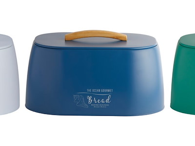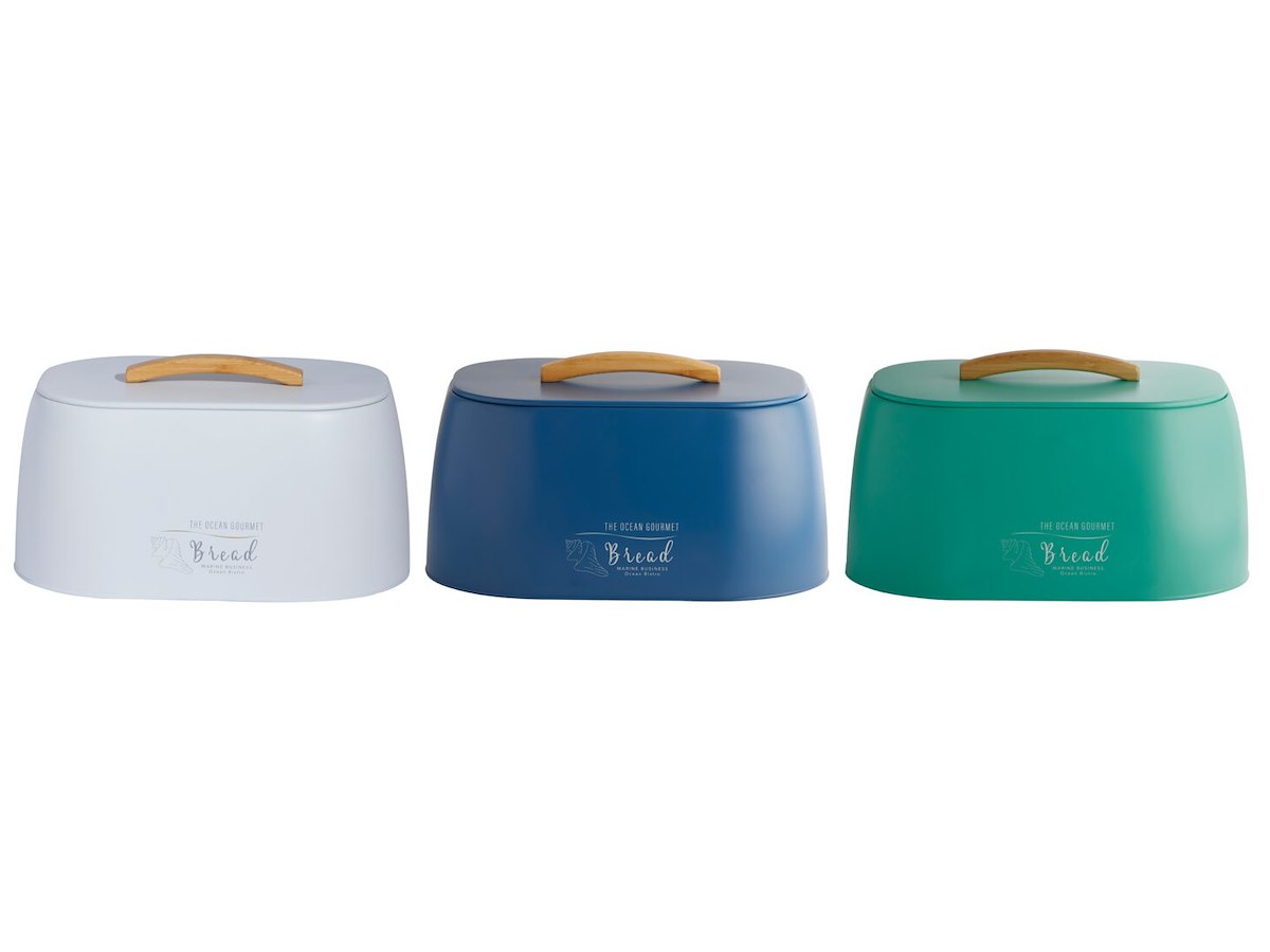 Grazioso portapane di generose dimensioni, ideale per conservare pane, dolci o cereali. Parte della collezione Menorca, che include barattoli da cucina, tazze, vassoio con manici in legno e design dorato, e porta utensili con mestoli in legno. Disponibile in bianco, blu o turchese, perfetto per barca o casa.