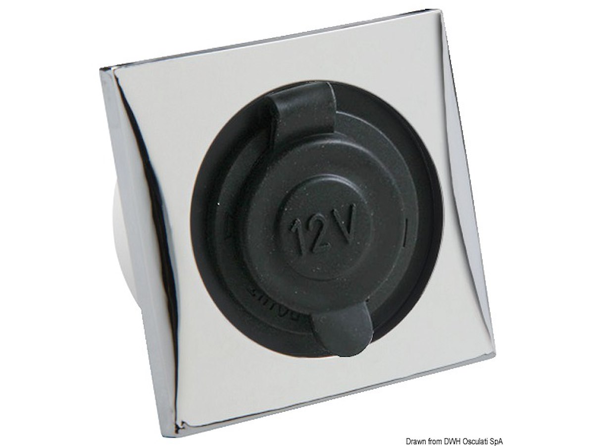 Presa corrente stagna tipo accendino. Colore - frontalino: COLORE_cromato_pieno Cromato Colore - presa: COLORE_nero_pieno Nero Incasso Ø mm: 53 V: 12