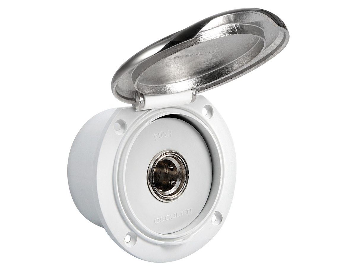 Si collega alla rete idrica di bordo (acqua dolce) o alla pompa Washdown (acqua salata) e mantiene in pressione la linea. Il tubo di lavaggio si innesta a scatto nella presa e fa automaticamente partire la pompa. Box in ASA resistente agli UV, meccanismo in ottone cromato.