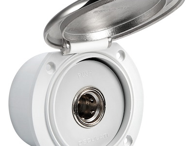 Si collega alla rete idrica di bordo (acqua dolce) o alla pompa Washdown (acqua salata) e mantiene in pressione la linea. Il tubo di lavaggio si innesta a scatto nella presa e fa automaticamente partire la pompa. Box in ASA resistente agli UV, meccanismo in ottone cromato.