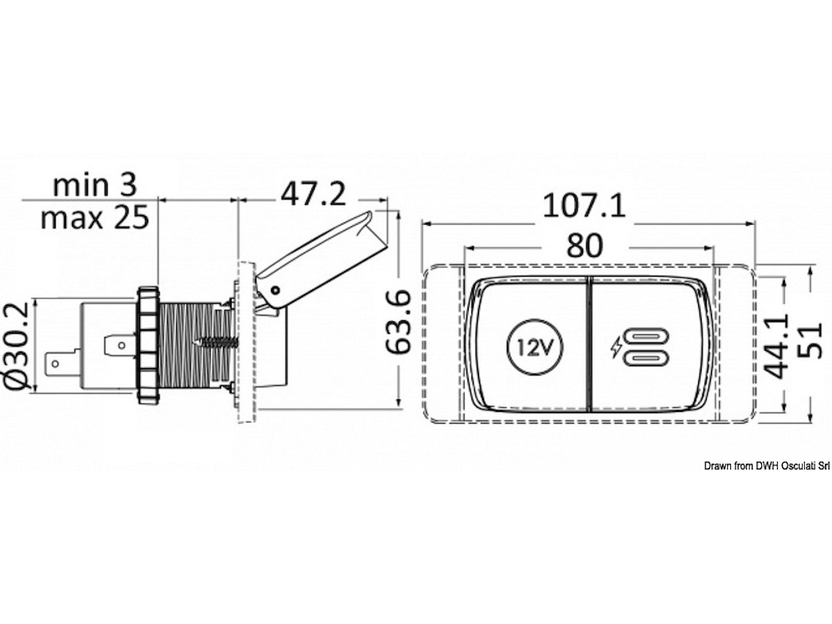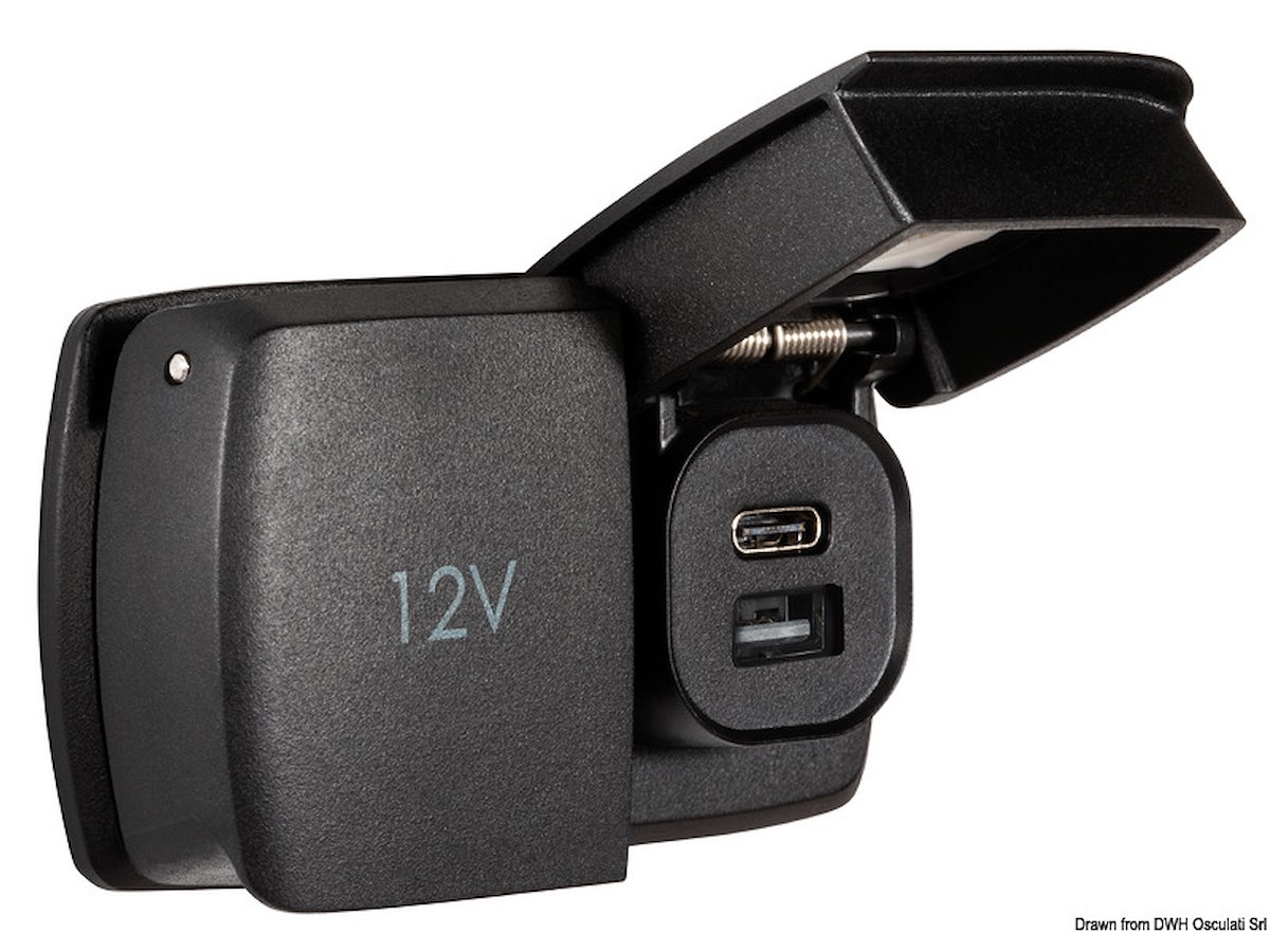 Descrizione: Presa USB A+C e presa corrente V: 12/24 Corrente max A: 6 Ø foro installazione mm: 2x32
