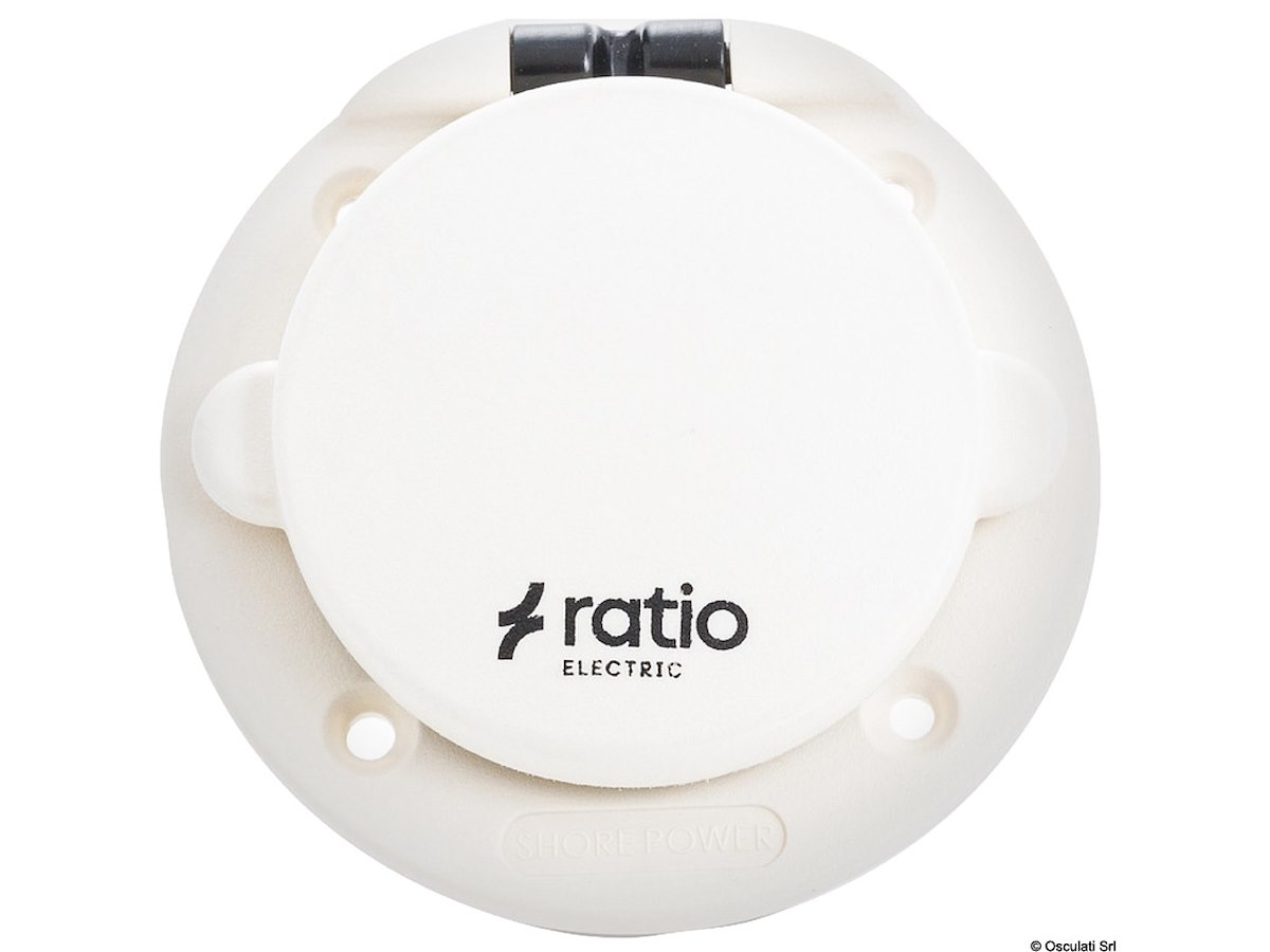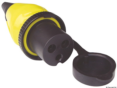 Presa da incasso a 3 poli maschio con portello a tenuta stagna e copertura posteriore per protezione cavi, contatti in ottone argentato. Spina volante femmina (in policarbonato + Moplen) con sistema blocca cavo e contatti in ottone argentato; cappuccio proteggi spina in PVC con ghiera a rotazione rapida in Luran resistente UV.