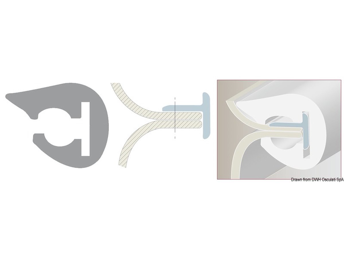 Profilo in PVC flessibile con supporto in PVC semi rigido. Prende facilmente qualsiasi piega. Adatto per scafi con giunzione a labbro, rotoli da 24 m. Ordine minimo 24 m per modello .