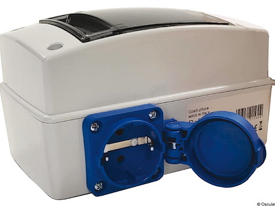 Box in ABS bianco compatto con sportello impermeabile IP65, dotato di salvavita, magnetotermico e cavo 3G di lunghezza 3 metri.