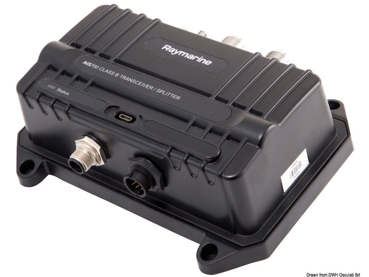 L' AIS700 Raymarine è un ricetrasmettitore con sistema di identificazione automatica (AIS) di Classe B e uno splitter integrato per l'antenna VHF; collegamenti multipli tra cui SeaTalkNG, NMEA2000, NMEA0183.