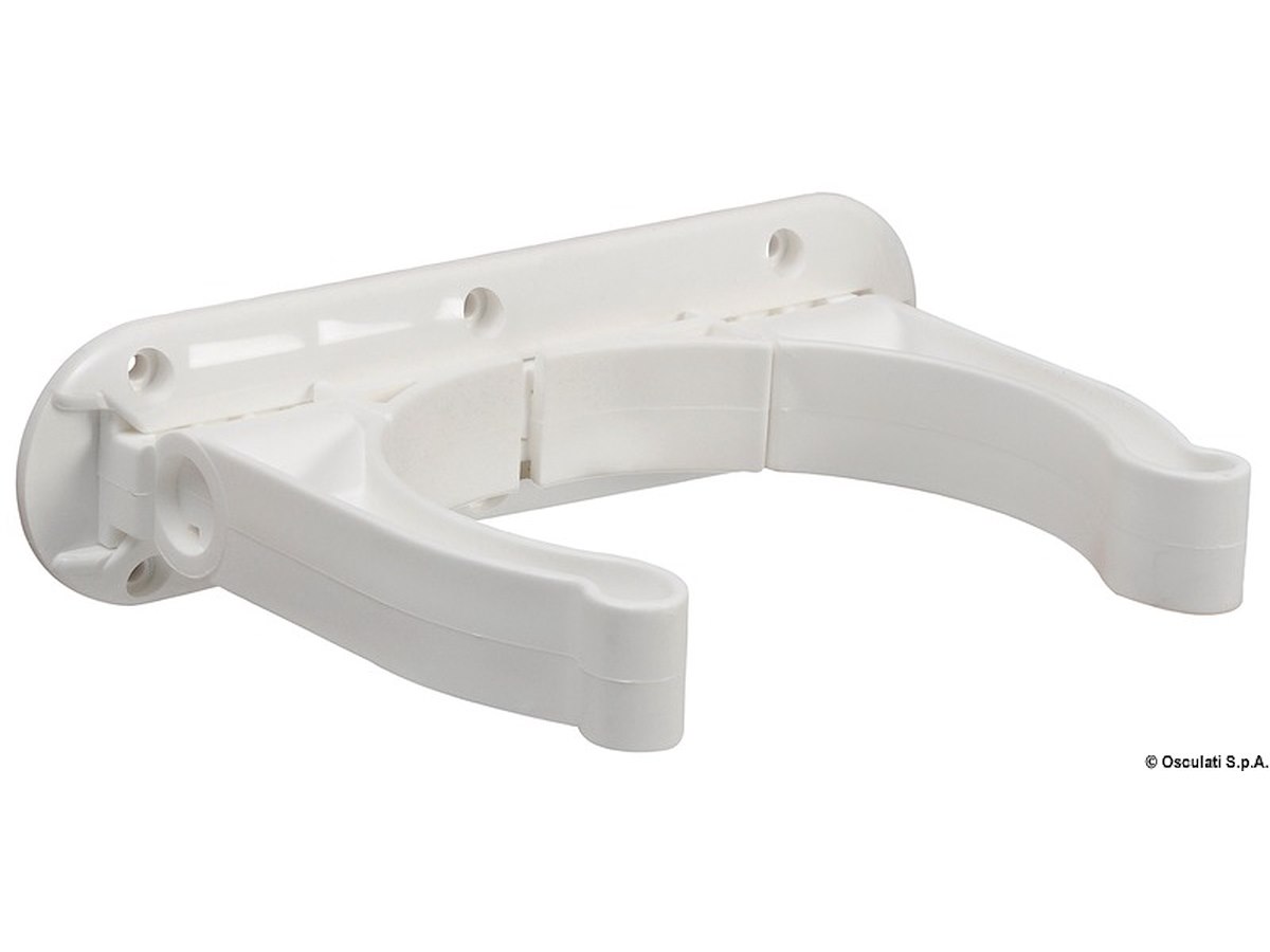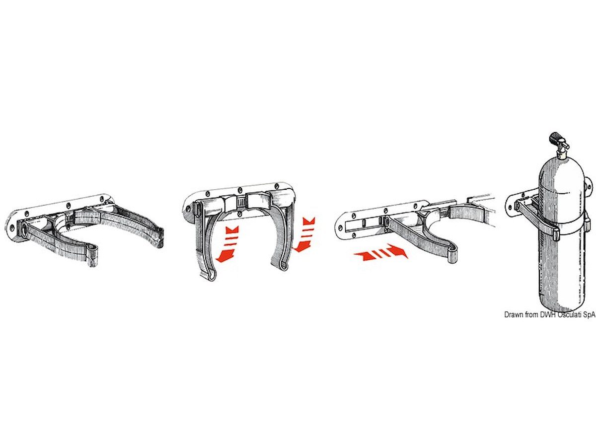 Sistema di fissaggio a parete per le bombole da sub, universale. Viene fornita una base in nylon a slitta, da fissare a parete, nella quale si inserisce la staffa portabombola che é regolabile in larghezza e pieghevole. Il tutto é fabbricato in polipropilene bianco. Il kit é composto da 2 basi + 2 staffe.
