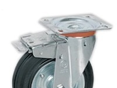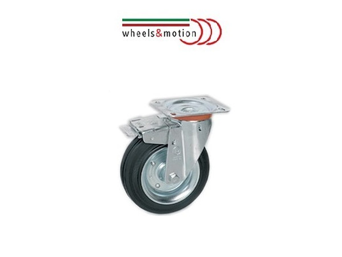 ruote con nucleo in lamiera stampata e zincata ed anello in gomma piena nera a profilo trapezoidale, con supporto girevole a piastra con freno anteriore