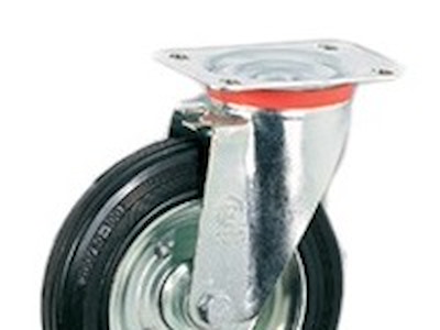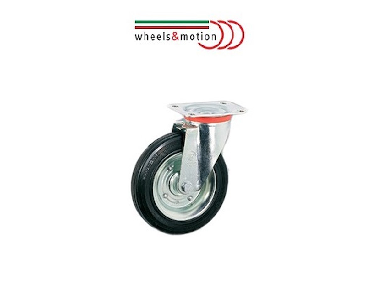 ruote con nucleo in lamiera stampata e zincata ed anello in gomma piena nera a profilo trapezoidale, con supporto girevole a piastra