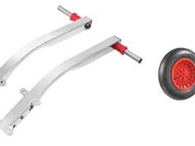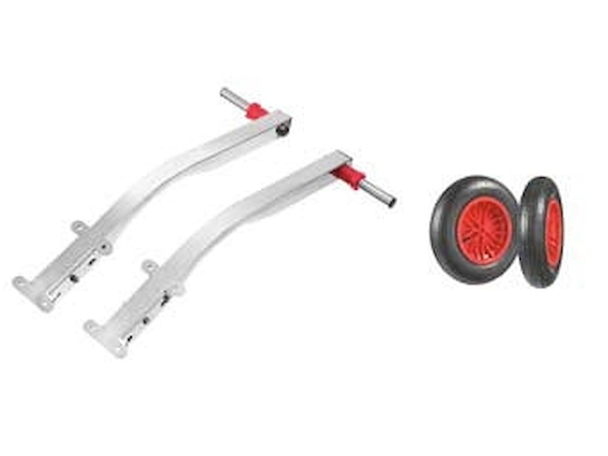 kit completo per l'alaggio (sistema a ribalta) per tutti i tipi di battelli pneumatici. Il kit comprende gambi ed attacchi in acciaio inox, pneumatici a sezione larga con cerchi in nylon