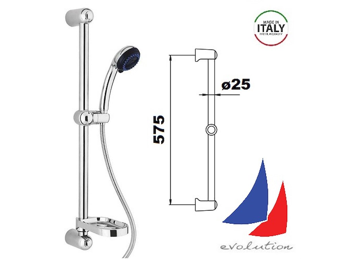 saliscendi cromato per doccia, completo di portasapone, flessibile SILVER 150cm e doccetta anticalcare