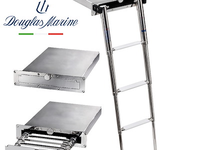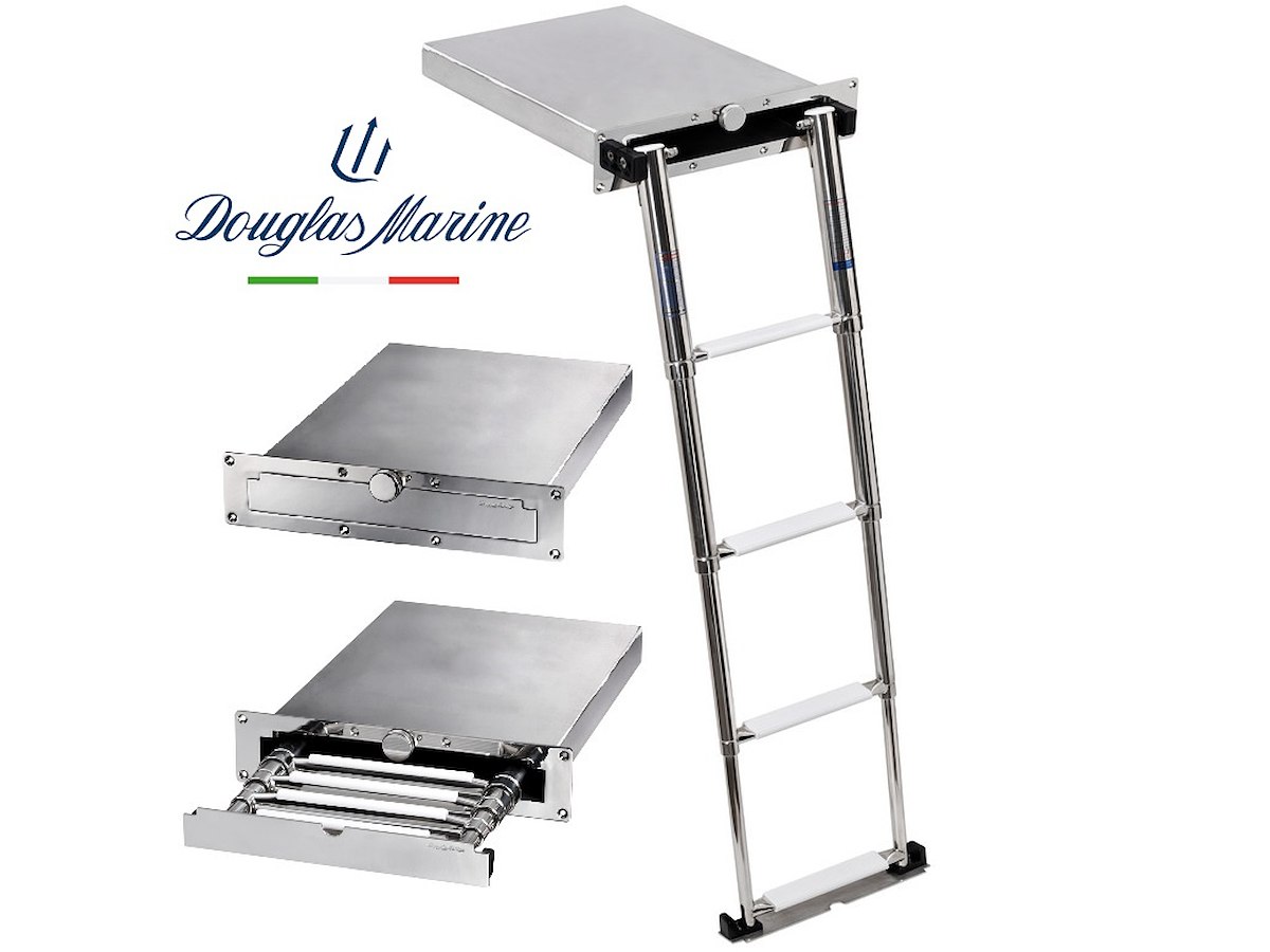 scaletta telescopica a scomparsa realizzata in acciaio inox AISI 316 completa di chiusura manuale e sistema di estrazione guidata che permette una migliore scorrevolezza e precisione di movimento, vano a incasso a scomparsa nella plancetta