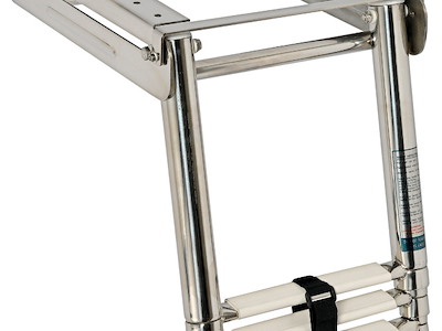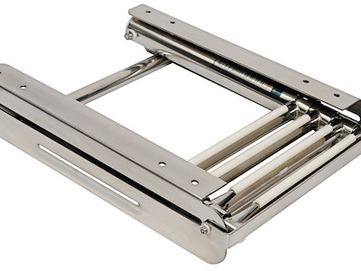 Completamente in acciaio inox lucidato a specchio. Gradini ovali con pedana in plastica bianca, versione con fermo frontale scatolato della parte sfilabile.