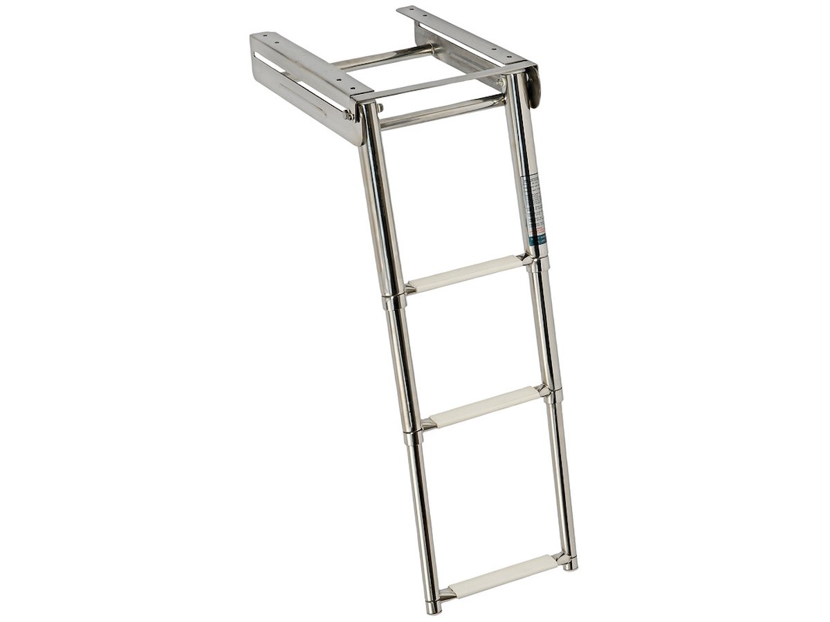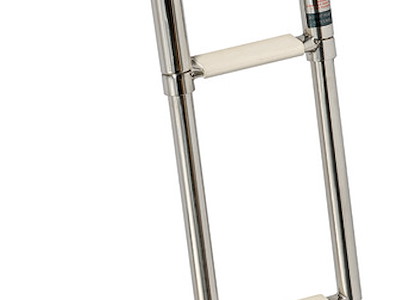 Completamente in acciaio inox lucidato a specchio . Gradini ovali con pedana in plastica bianca, versione con fermo frontale scatolato della parte sfilabile.