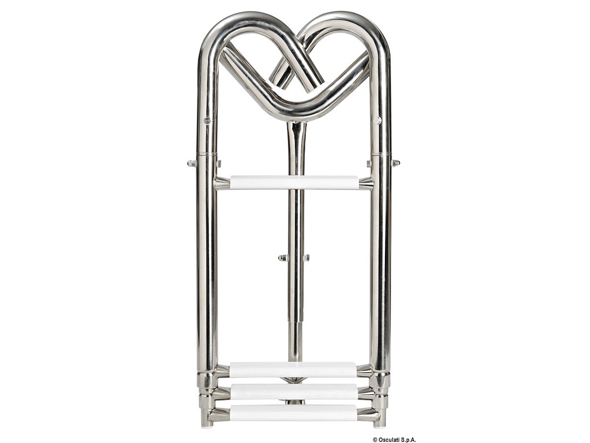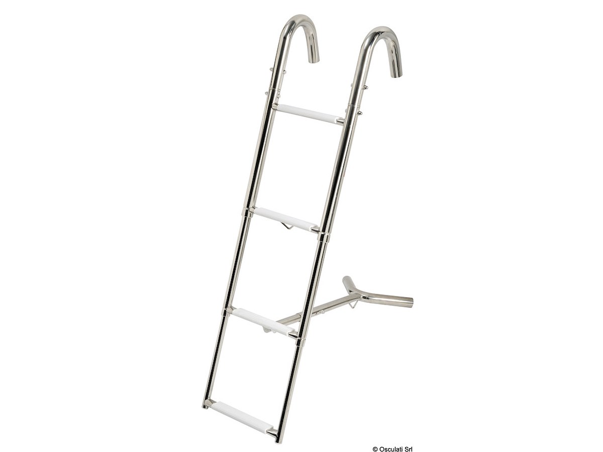 Realizzata in acciaio inox AISI 316 lucidato a specchio. I bracci sono girevoli e si agganciano al pulpito. Caratteristiche tecniche: scaletta telescopica con gradini ovali rivestiti in plastica bianca; bracci di aggancio girevoli; puntone di appoggio alla prua telescopico.