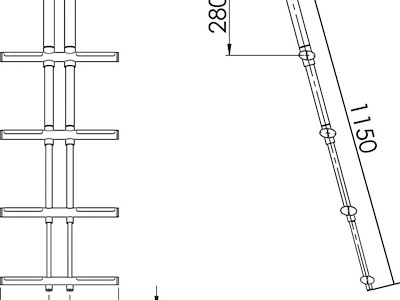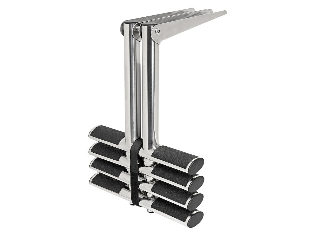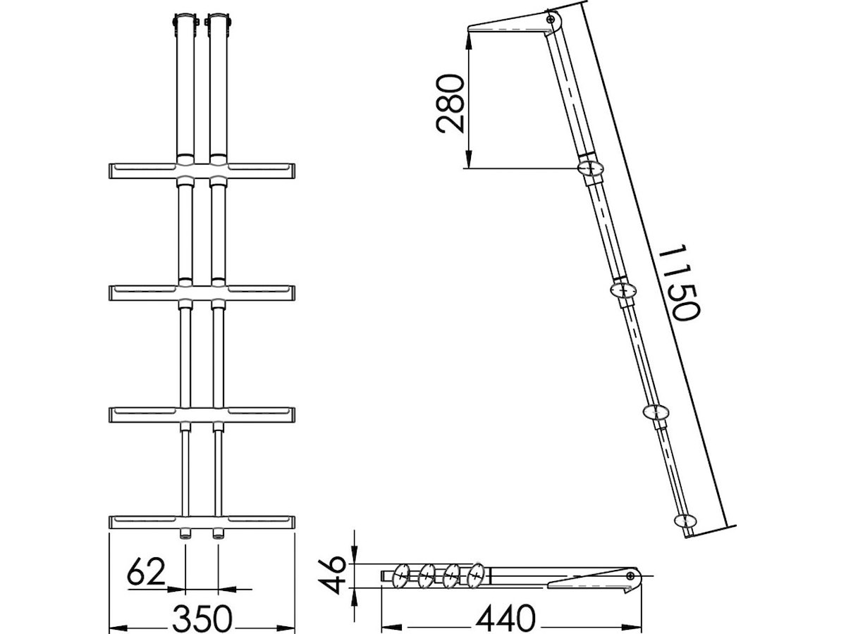 Ø tubi mm: 19/25/32/38 Gradini - N.: 4 Gradini - colore: Neri Lunghezza mm - aperta: 1150 Lunghezza mm - chiusa: 440 Larghezza mm: 350 Fissaggio: Sopra plancetta
