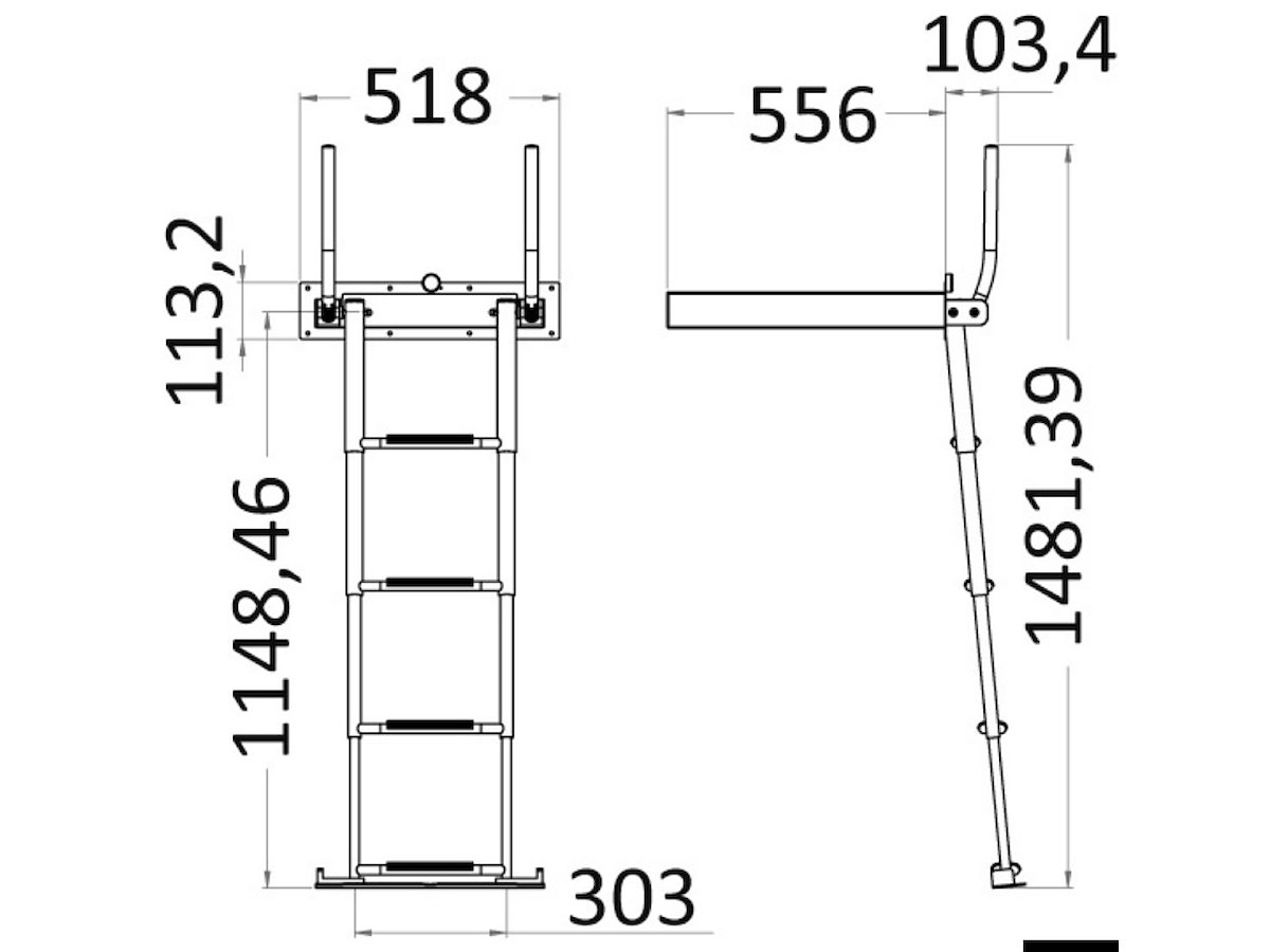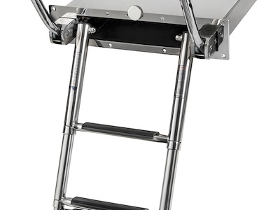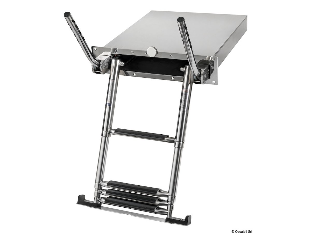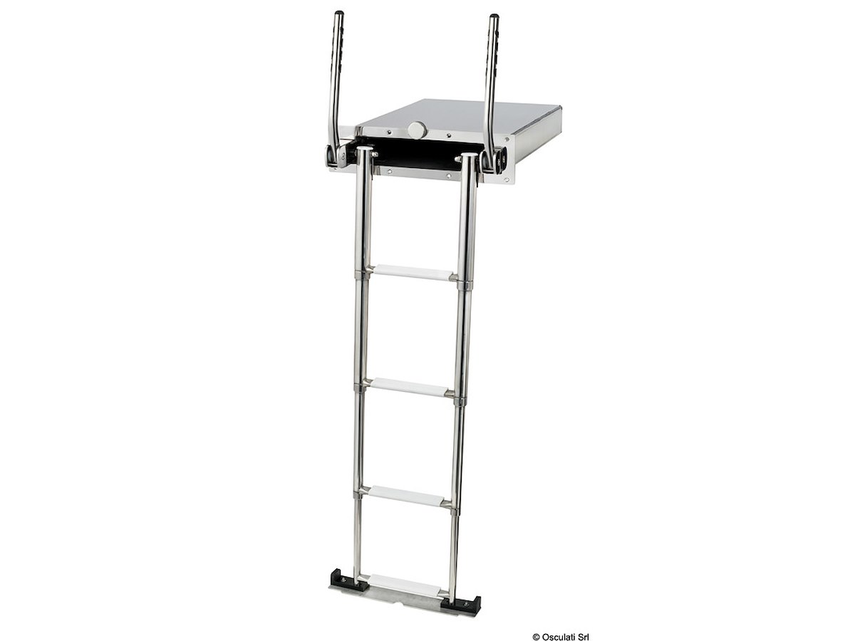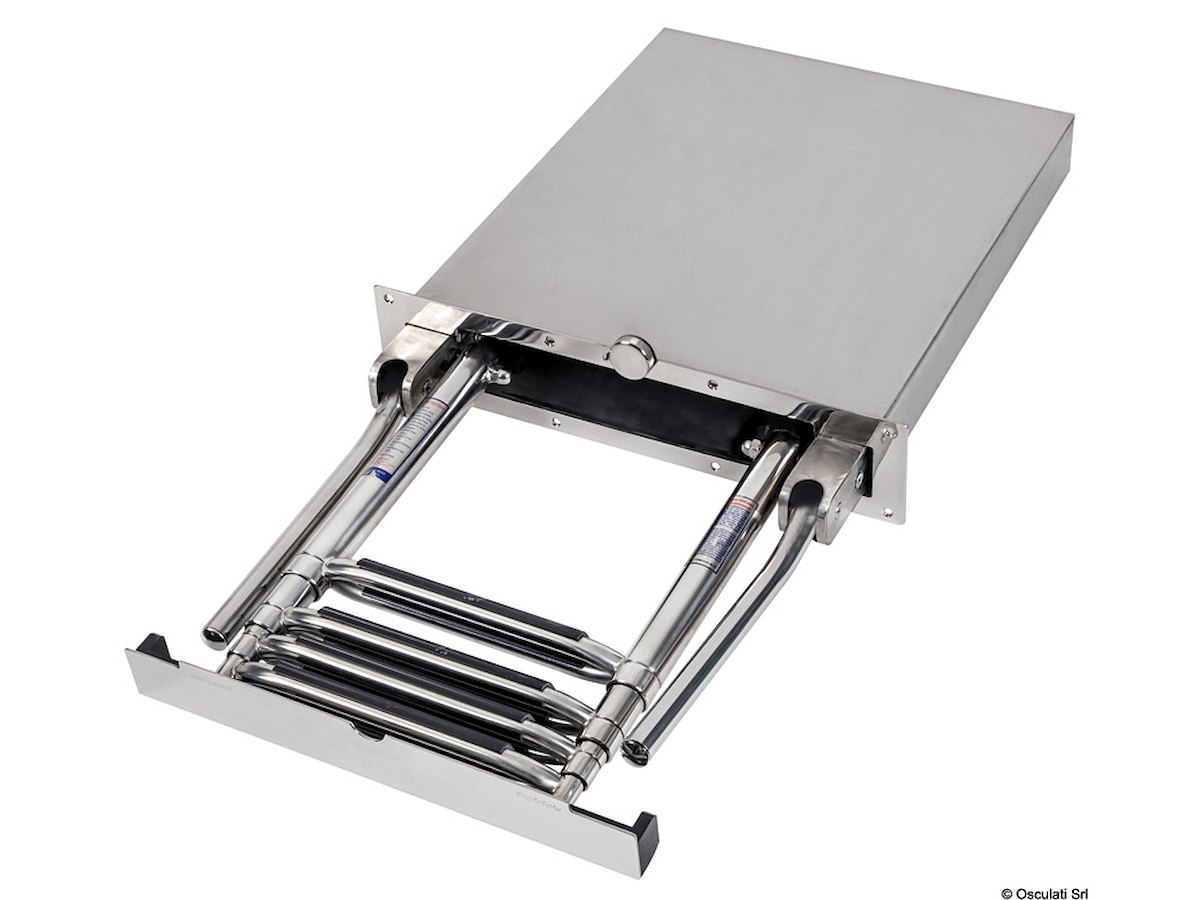Scaletta telescopica ad incasso con maniglie, in acciaio inox AISI316 a 4 gradini, e meccanismo di chiusura maniglia che facilita il recupero della scaletta dalla plancia.