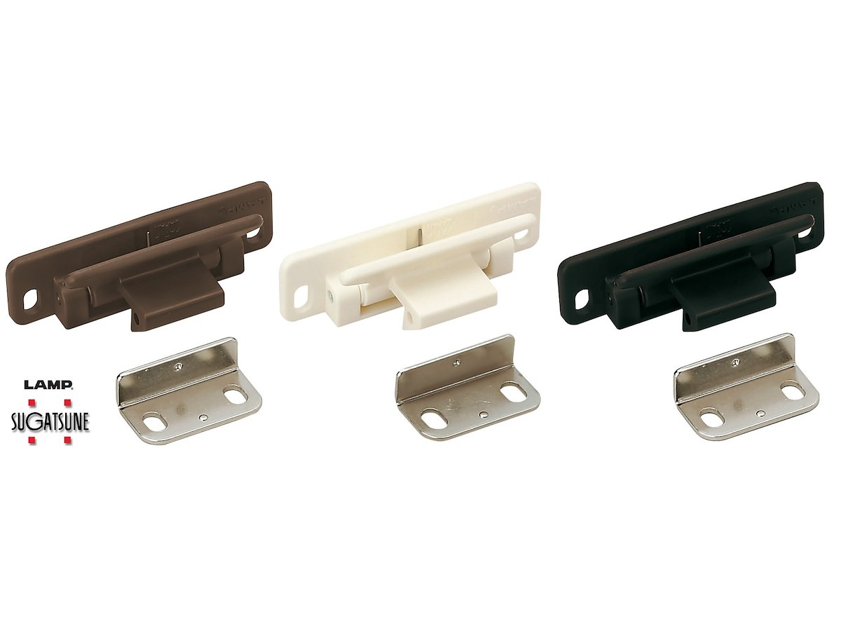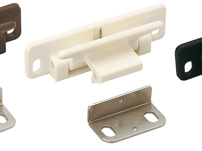 scrocchetto leva a scatto per antine senza pomoli e maniglie, realizzato in poliammide, la posizione di installazione può essere regolata (corpo verticale +/- 1,5mm e contropiastra orizzontale +/- 1,5mm), forza di ritegno 196N