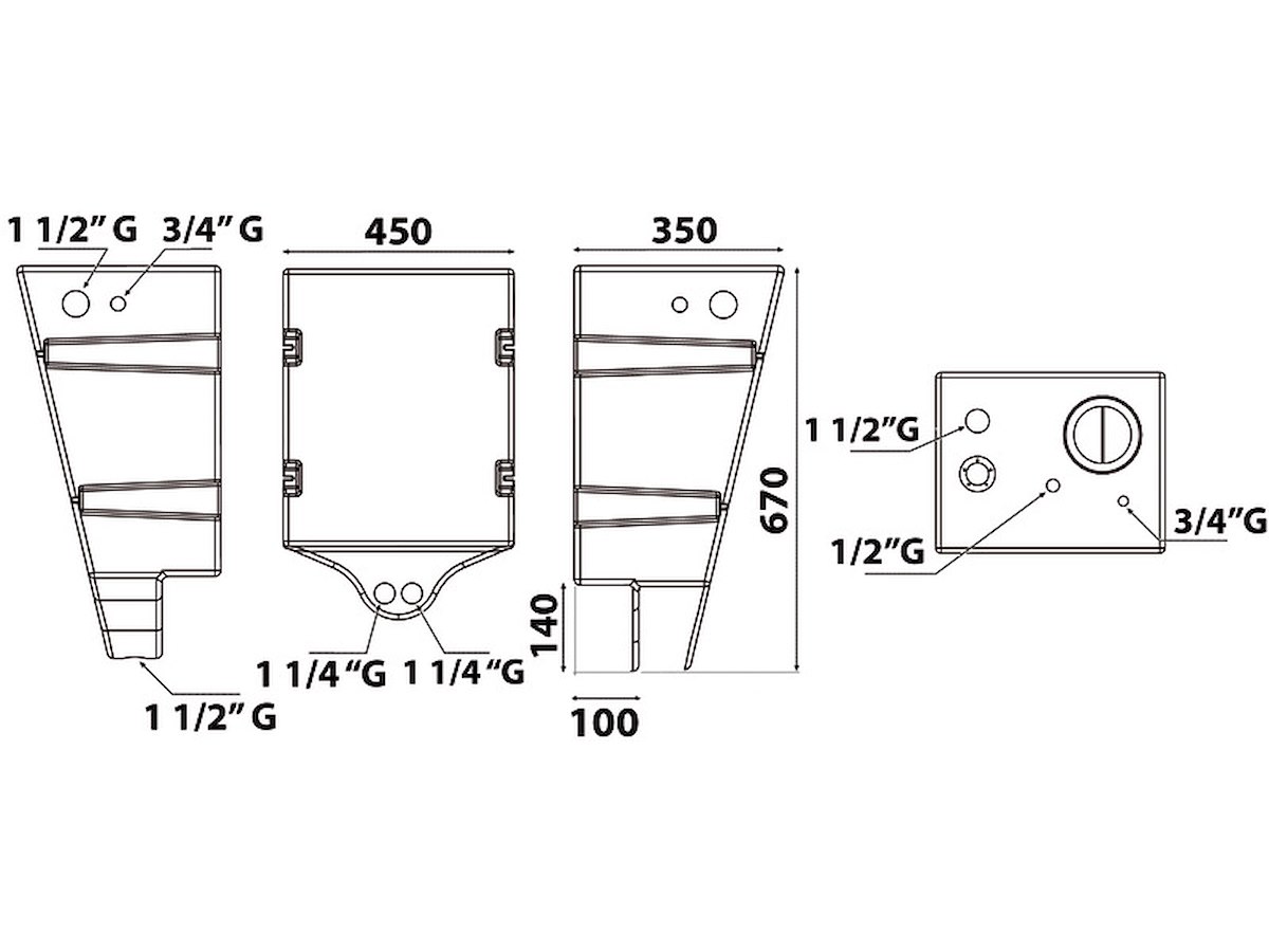 Progettato per essere svuotato per gravità, senza impiego di alcuna pompa. Completo di filettature femmina da 3/4" - 1" 1/2 per carico, 1" 1/4 per scarico, sfiato + flangia indicatore livello. Fabbricati secondo ISO 8099.