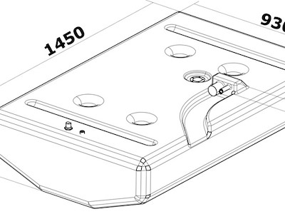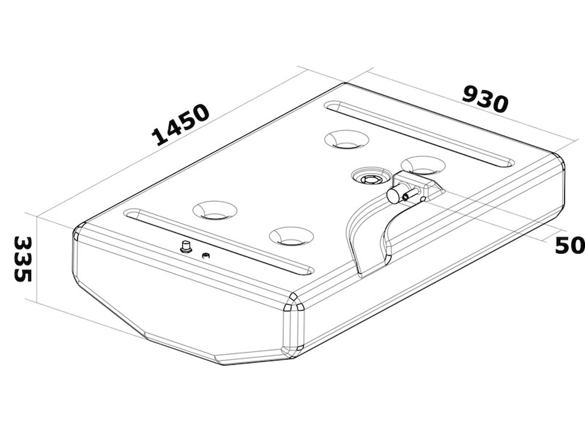 Capacità l: 347 Tipo carburante: Benzina misure mm: 1450x930x335 (+50) h Max lunghezza per galleggiante cm: 28 Sfiato Ø mm: 19 nella stampata Imbarco Ø mm: 38 Pescante Ø pollici: Gomito 90°, filetto femmina 3/8" + predisposizione 2° pescante