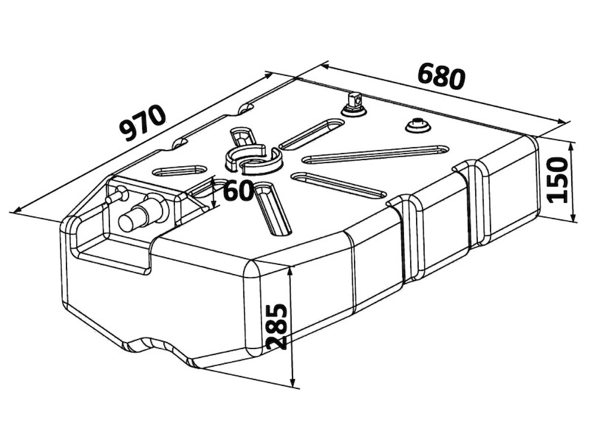 Capacità l: 116 Tipo carburante: Benzina misure mm: 970x680x285 (+60) h Max lunghezza per galleggiante cm: 20 Sfiato Ø mm: 16 nella stampata Imbarco Ø mm: 38-50 Pescante Ø pollici: Gomito 90°, filetto femmina 3/8" + predisposizione 2° pescante