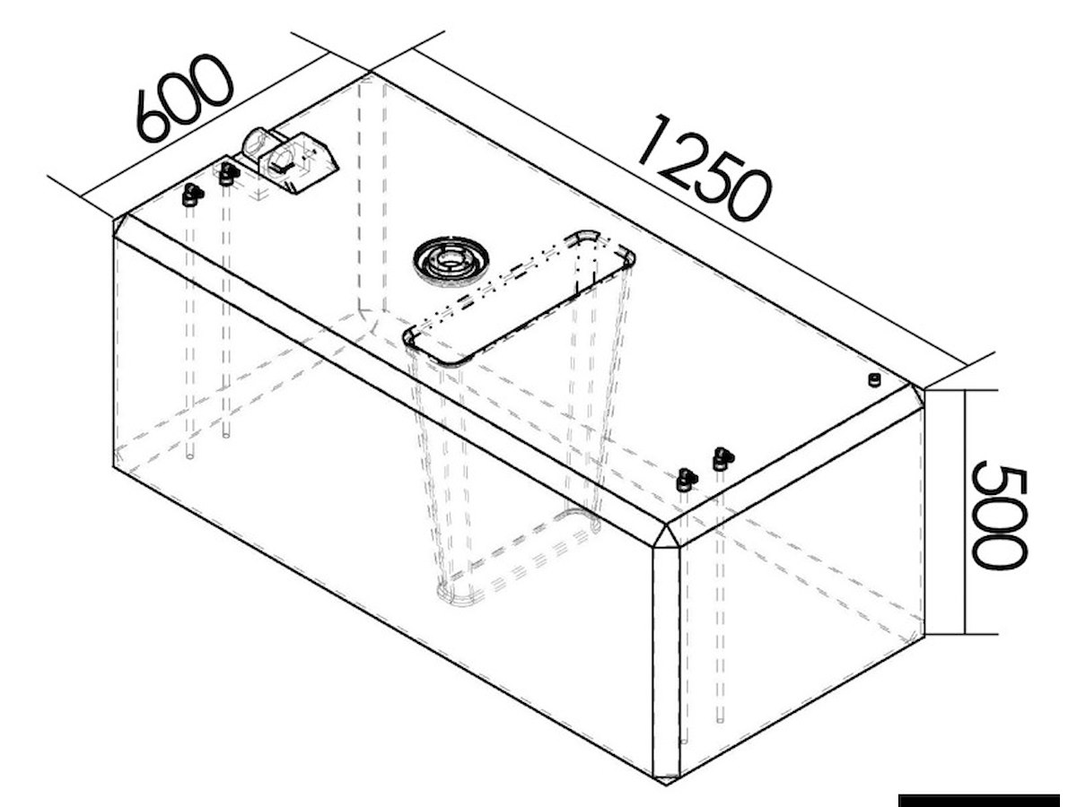 Capacità l: 336 Pianta mm: 1250x600 Altezza mm: 500 Sfiato mm: 3/8" Carico mm: 50 Uscita mm: 10 (4)
