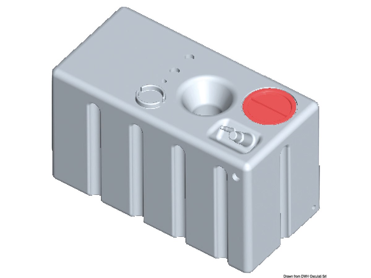 In polietilene alimentare lineare. Completo di tappo di ispezione + predisposizioni multiple per carico, scarico, sfiato con filetti femmina da 1" 1/4, 3/4", 1". Predisposto per installazione indicatore di livello con flangia VDO 5 fori (27.160.xx; 27.161.xx; 27.166.xx).