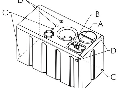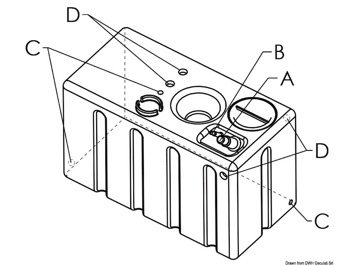 Capacità l: 247 Base mm: 1000x500 Altezza mm: 600+25 A - Vent Ø mm: 16/20 B - Filler cap Ø mm: 38/50 C: 3/4" D: 1"1/4 Spessore standard mm +/- 5%*: 7