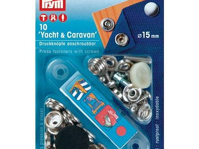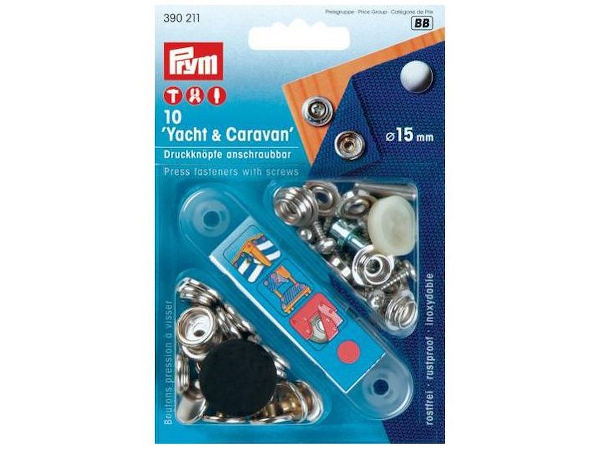 kit bottoni nichelati Ø15mm per fissaggio su parti rigide di imbarcazioni e caravan, confezione maschio + femmina completa di attrezzo per montaggio
