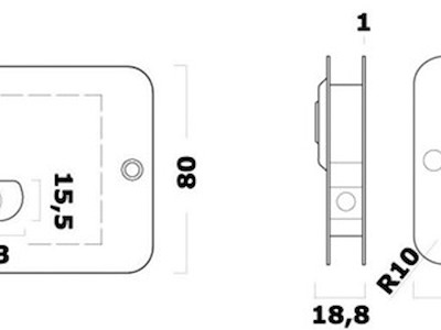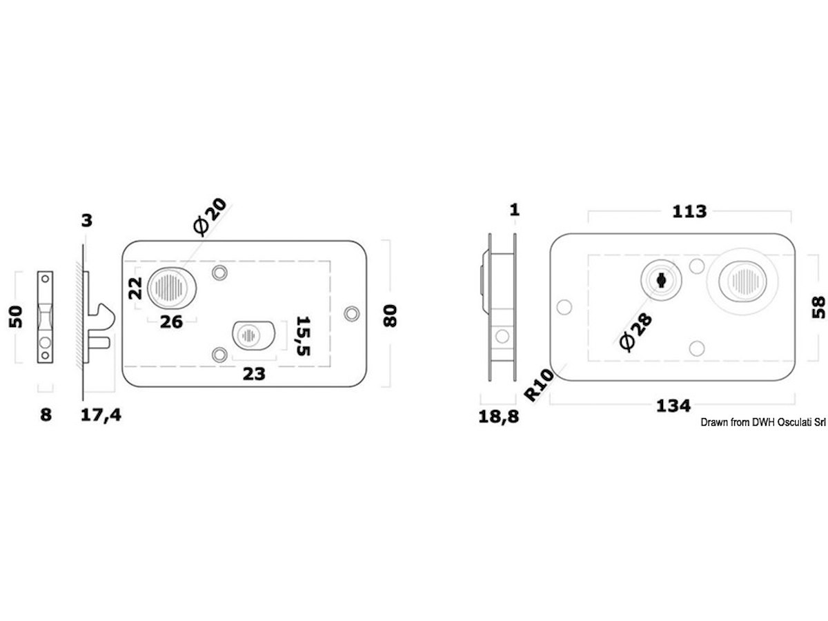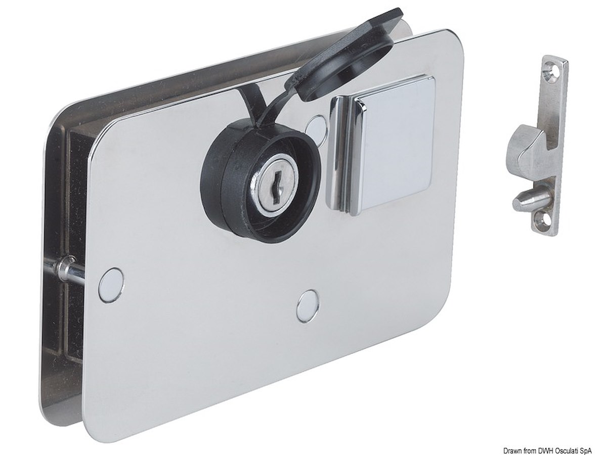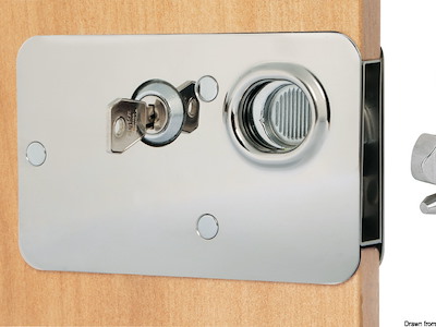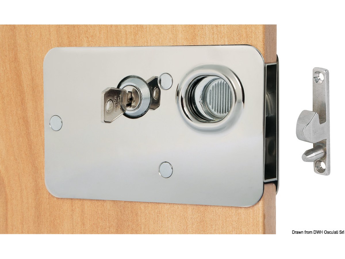 Fabbricata in ottone cromato. Da incasso per porte spessore 15 mm. Con cilindro di sicurezza, blocco dall'interno e scontro.