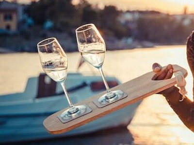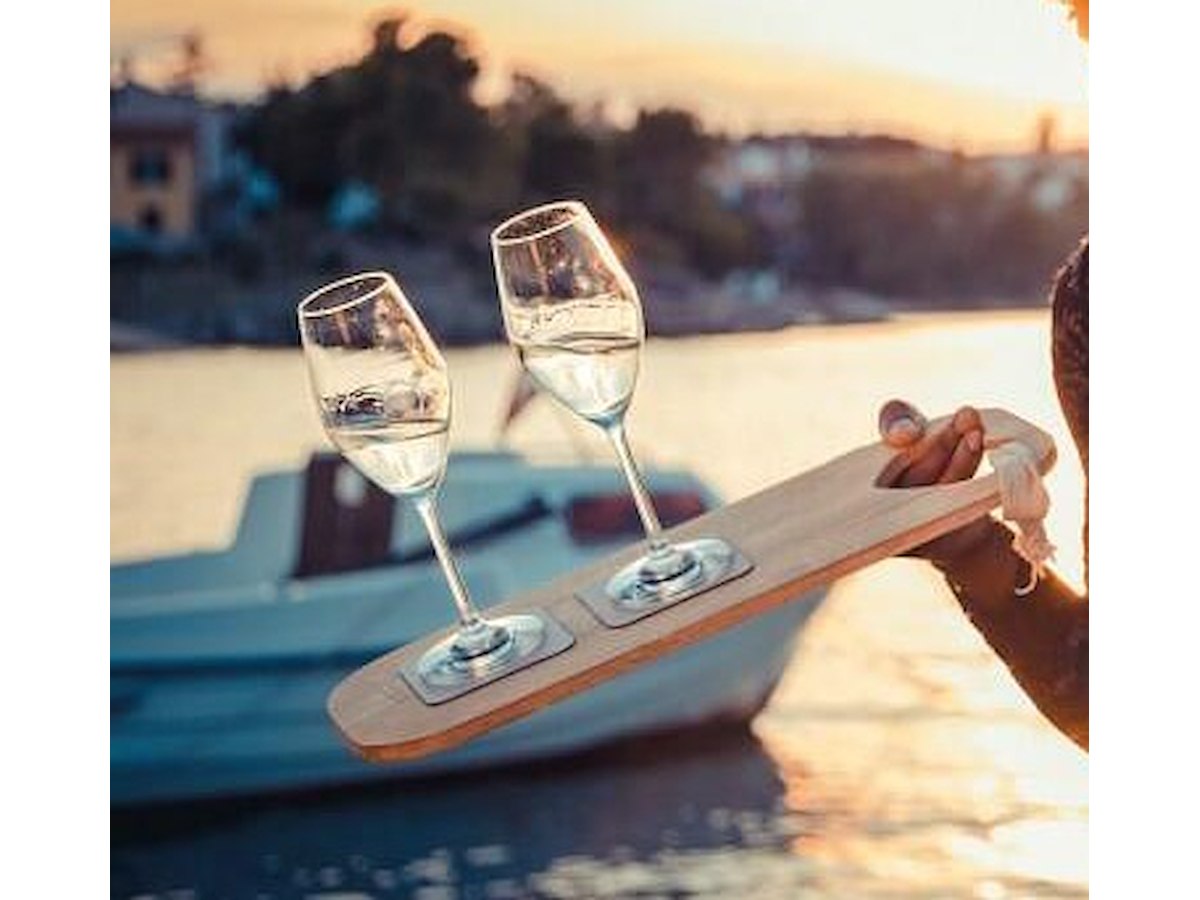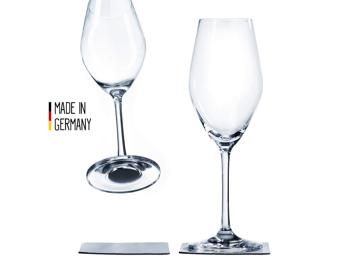 Calici da champagne in cristallo di alta qualità con magneti integrati sul fondo che ne rendono sicuro l’appoggio anche quando il mare è mosso. Rapporto di tenuta perfetto tra sottobicchiere e bicchiere. I sottobicchieri metallici in nano-gel sono rimovibili, durevoli, non lasciano residui e aderiscono a tutte le superfici, set da 2 bicchieri, compresi di sottobicchieri