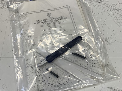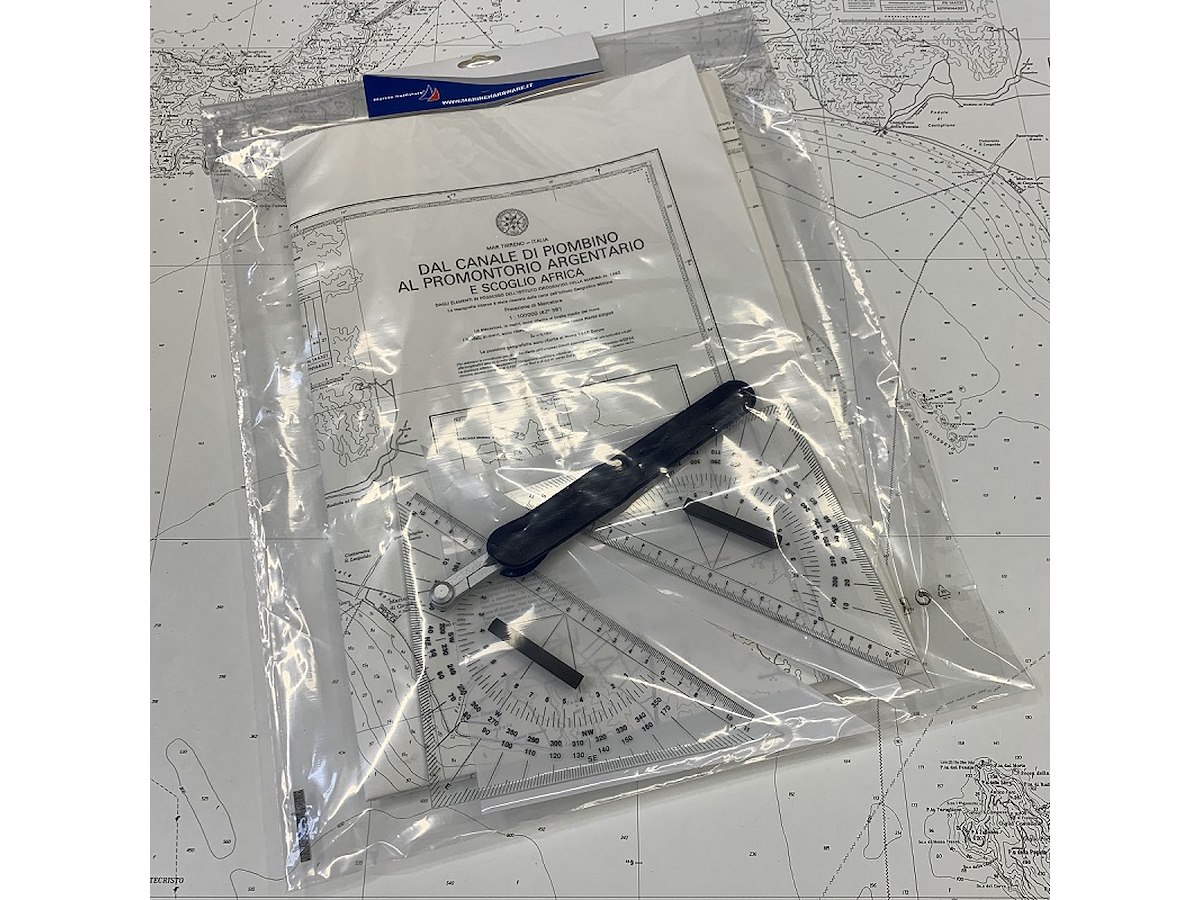 pratico completo carteggio per scuole nautiche in busta trasparente, contiene 2 squadrette serigrafate con maniglia, compasso, carta didattica