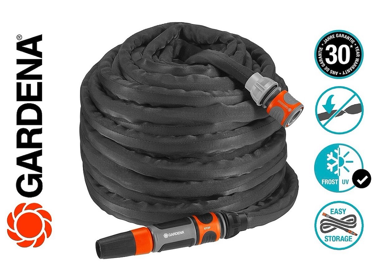 tubo flessibile Liano versione XTREME originale Gardena, ultraresistente grazie alla tecnologia della robusta fibra tessile intrecciata, Ø13mm resistenza fino a 35BAR, completo di lancia regolabile e raccordi, prezzo al rotolo