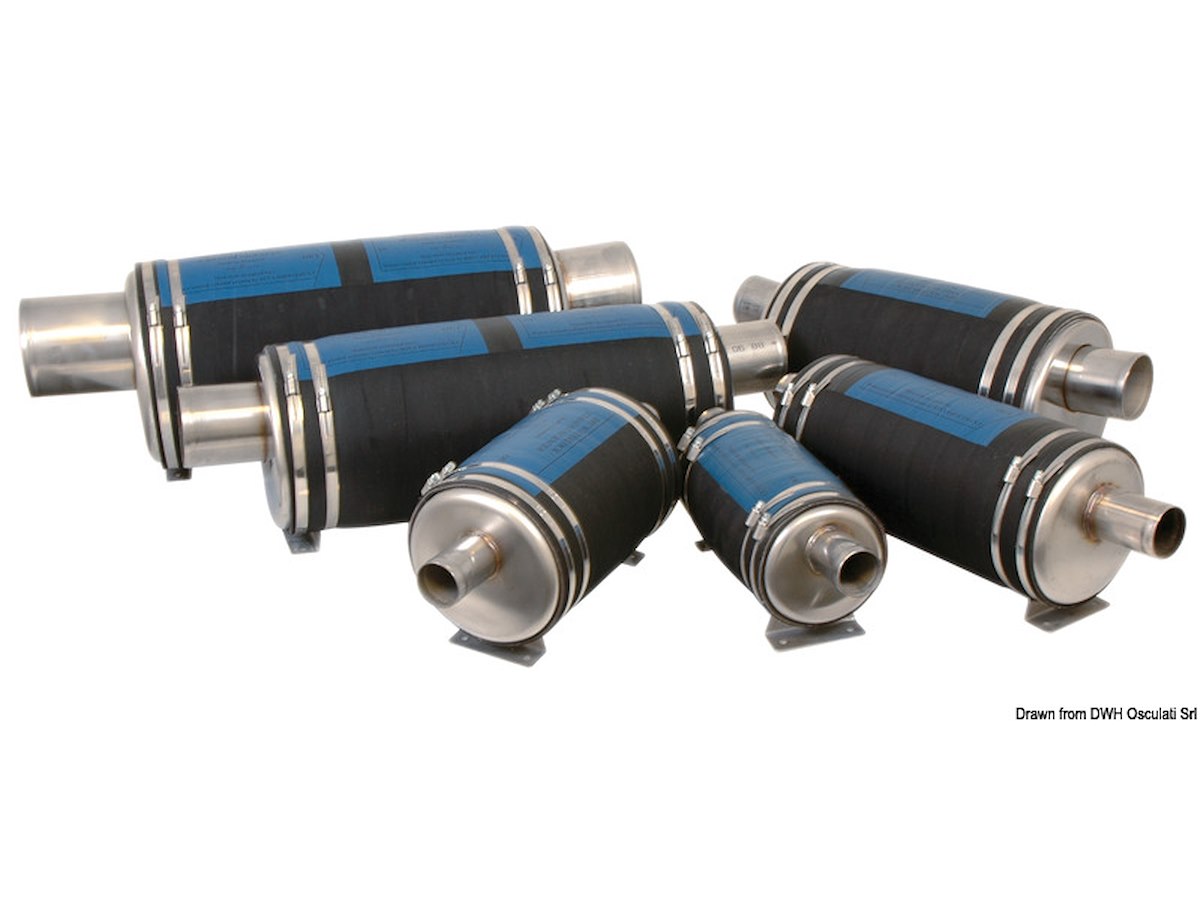 Riducono efficacemente la rumorosità con minima contropressione. La grande capacità di acqua contenuta elimina il rischio di sifonaggio e di ritorno dell'acqua con motore fermo. Le staffe di fissaggio possono essere ruotate a piacere. Componenti: fondelli in acciaio inox + gomma rinforzata.