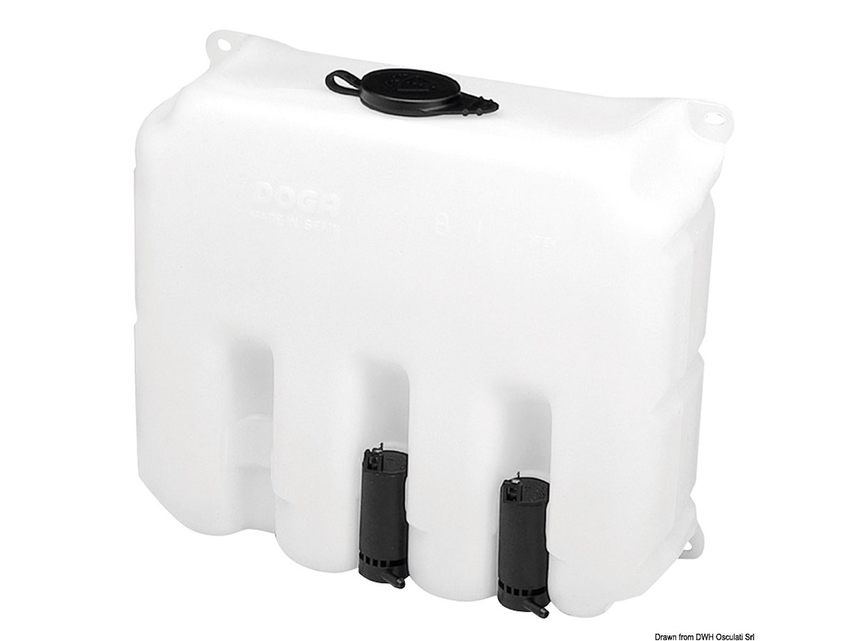 Serbatoio - Capacita l: 9,7 Serbatoio - V: 12 Serbatoio - N pompe: 2 per 2 tergi Accessori OPTIONAL - Raccordo a "T": [19.108.01] Accessori OPTIONAL - Passaparatia: [19.108.02] Accessori OPTIONAL - Valvola di non ritorno: [19.108.03] Accessori OPTIONAL - Spruzzatore acqua: [19.108.04] Accessori OPTIONAL - Tubo in PVC (5 mm - 24 m): [19.108.00]
