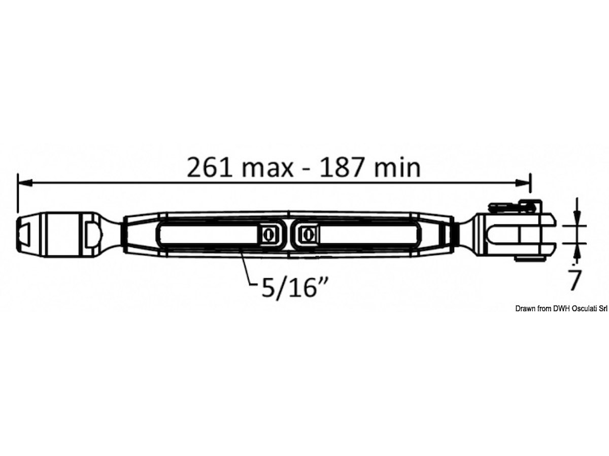Descrizione: Tenditore con canula aperta cromata Per cima Ø mm: 4 Filetto: 5/16" Perno Ø mm: 8 Carico di rottura Kg: 1700