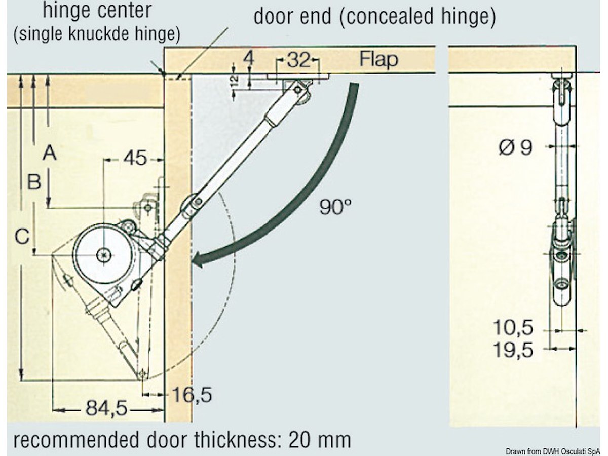 Una volta alzato lo sportello il braccetto lo tiene in posizione, alla chiusura il braccetto ammortizza la discesa fino al completo arresto dell’antina. Colore bianco. Venduto completo di piastrina di montaggio. Calcolo momento torcente. Un braccetto: lunghezza antina (cm) x 1/2 x peso antina (kg).