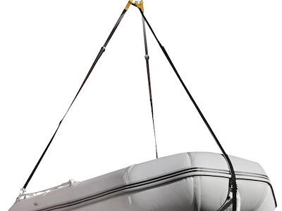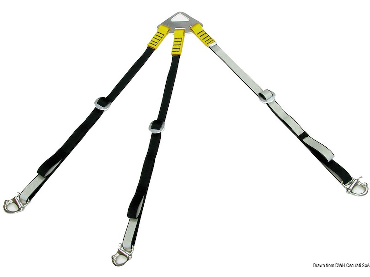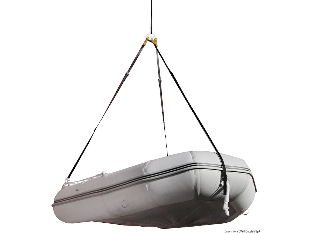 Di alta qualità, resistente UV per sollevamento tender di qualsiasi tipo. Piastra di sospendita e fibbie di regolazione in alluminio alta resistenza anodizzato. Moschettoni aggancio in acciaio inox AISI 316 ad apertura rapida. Carico max KG 400. Universali per qualsiasi gommone, in quanto regolabili. Articolo brevettato e certificato CE.