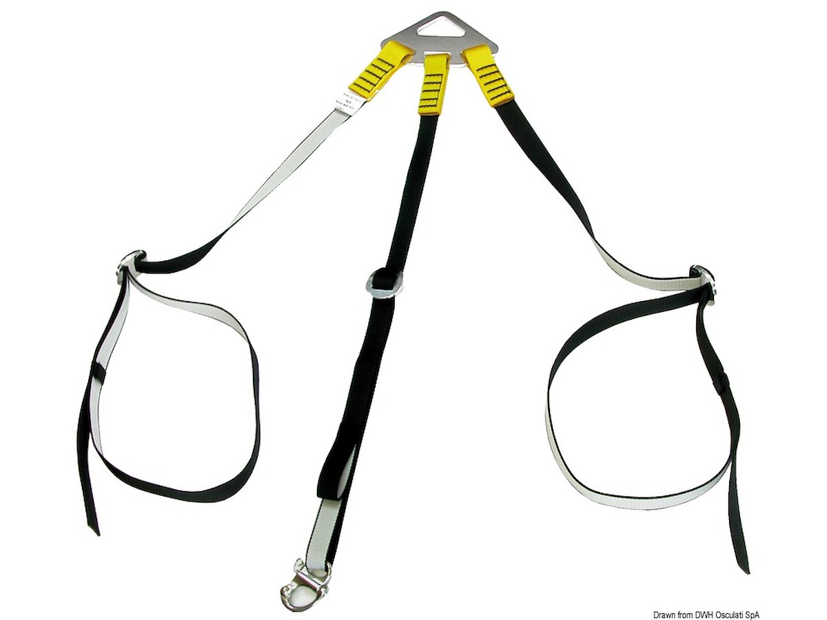Versione sospendita: A tre bracci, con 1 moschettone (prua) e 2 cinghie per tubolare posteriore Lunghezze utili occhio - occhio: Cinghia prua: min 30 cm - max 360 cm; cinghie poppa: min 30 cm - max 260 cm (considerando un tubolare diam ca. 50 cm)