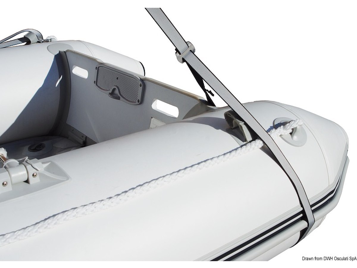 • Lunghezze utili occhio - occhio: Cinghia prua: min 30 cm - max 360 cm; cinghie poppa: min 30 cm - max 260 cm (considerando un tubolare diam ca. 50 cm)