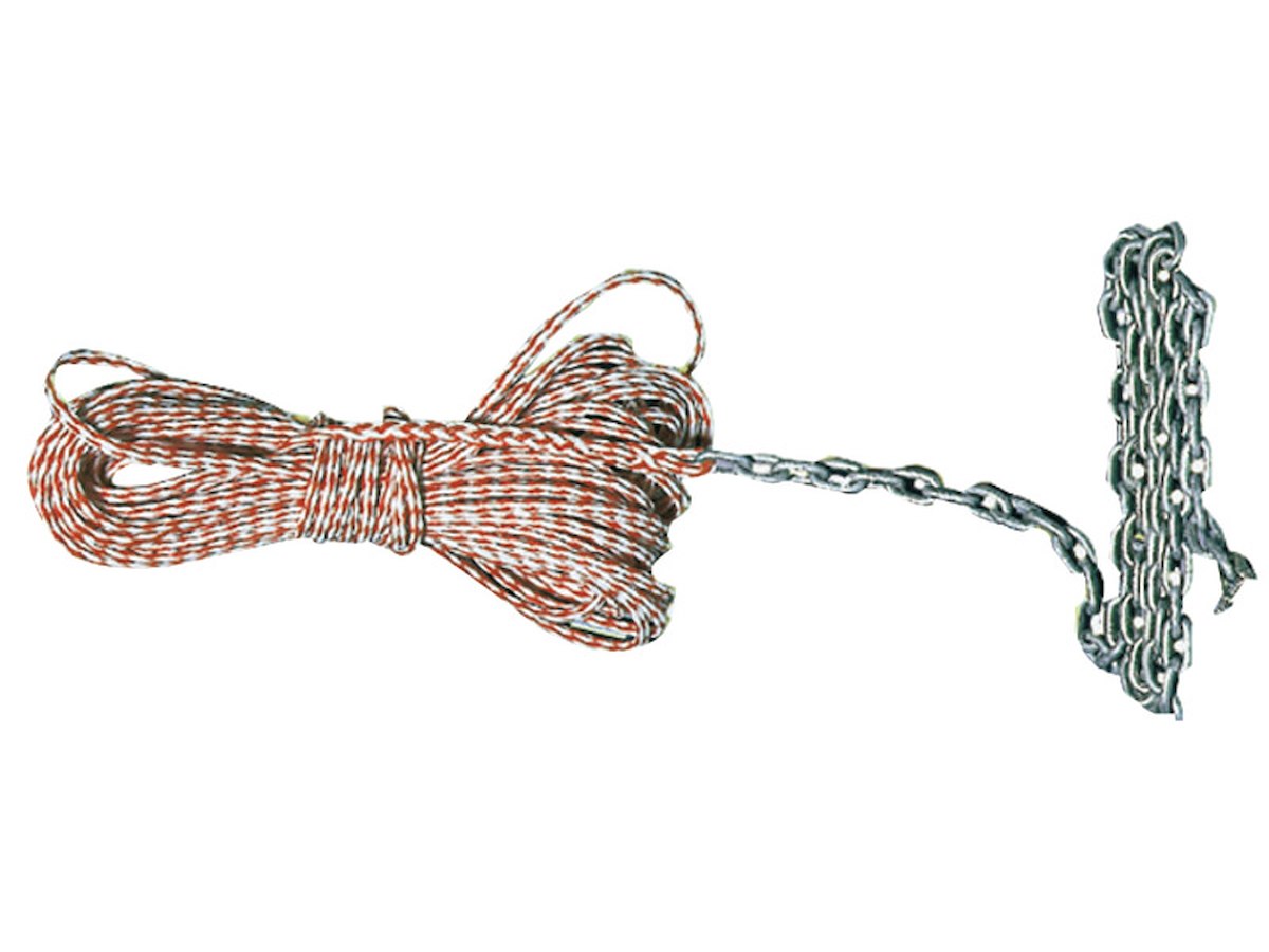 In levilene arancione regolamentare per ancore, completo di catena zincata da 2 m e grillo per collegamento all’ancora.