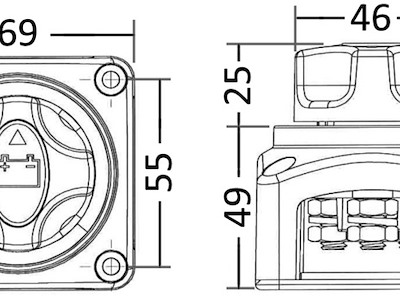 Uscita dei cavi possibile su 4 lati. Capacità max A 50V DC - per 30 sec: 1000 Capacità max A 50V DC - in continuo: 300 Capacità max A 50V DC - intermittente: 500 A Ø perni mm: 10 misure mm: 69x69x74 h