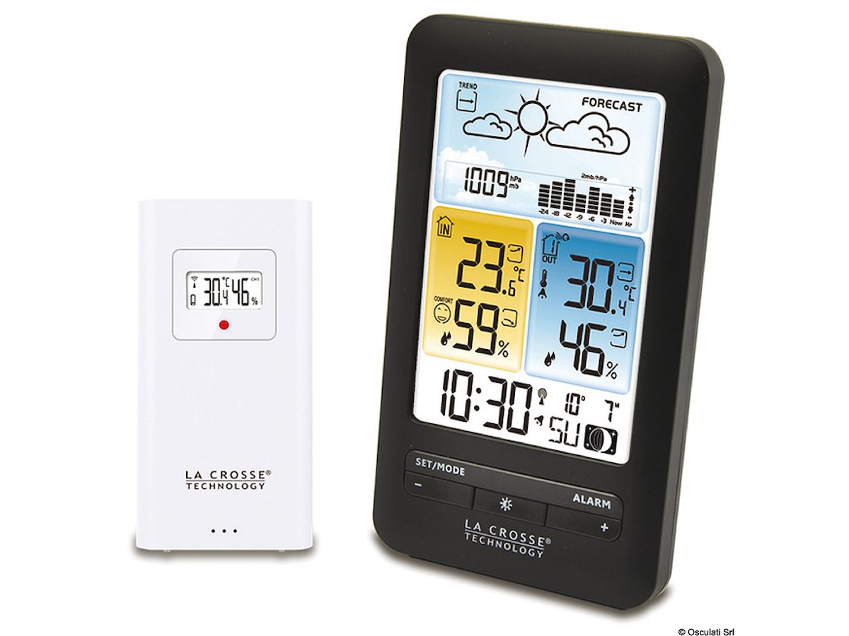 - Temperatura interna/esterna e umidità interna/esterna con tendenze + memoria minime e massime;