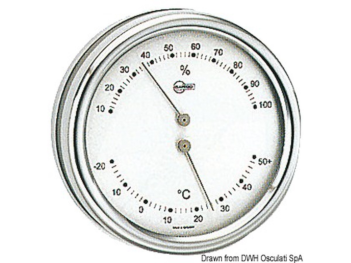 Variante: In acciaio inox lucido, quadrante argento Tipo: Termo/Igrometro Carcassa Ø mm: 102 Quadrante mm: 85