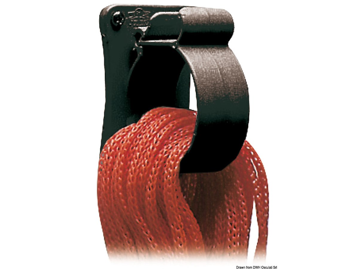 Con aggancio a scatto e fissaggio a parete con 4 viti. Base mm: 57x94 Passaggio mm: 60 Portata: 15 m di cima Ø 10 mm