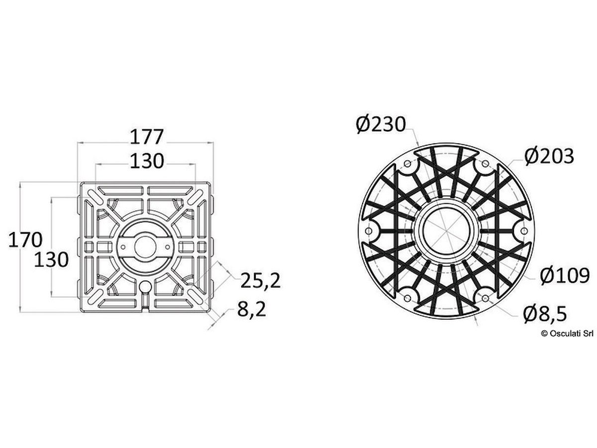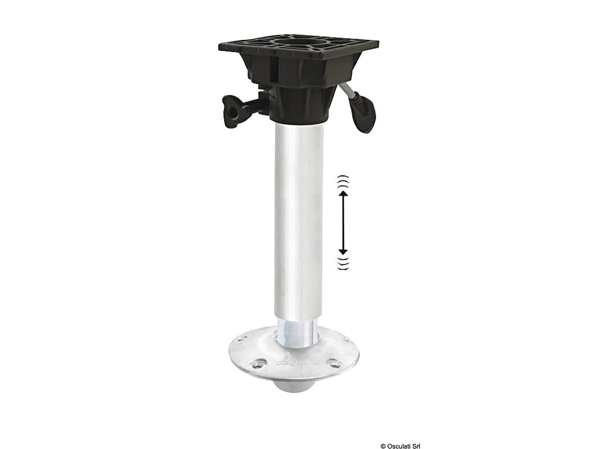 Regolabile in altezza tramite molla a gas. Dotato di sistema di ammortizzatore interno (Shock Absorber) per assorbire l'impatto della barca con le onde. Estraibile dalla base in alluminio anodizzato Ø 228 mm. Tubi alluminio anodizzato. Testa in nylon / fibra di vetro con foratura universale.