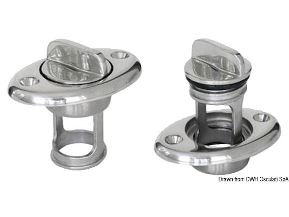 In acciaio inox AISI 316 lucidato a specchio. Con sicurezza per il tappo. Flangia mm: 43x64 Foro Ø mm: 32
