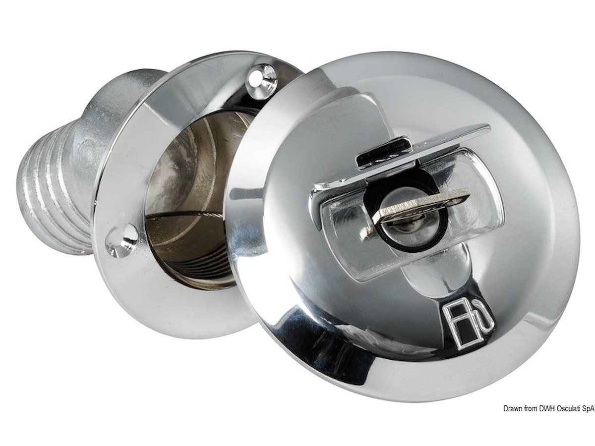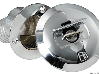 Tappo di rifornimento in ottone cromato - Tipo: FUEL Tappo di rifornimento in ottone cromato - Versione: Dritta Tappo di rifornimento in ottone cromato - Collo Ø mm: 50 Tappo di rifornimento in ottone cromato - Ø Esterno mm: 95 Solo tappo con chiave in ottone cromato, senza canotto: [20.668.21]